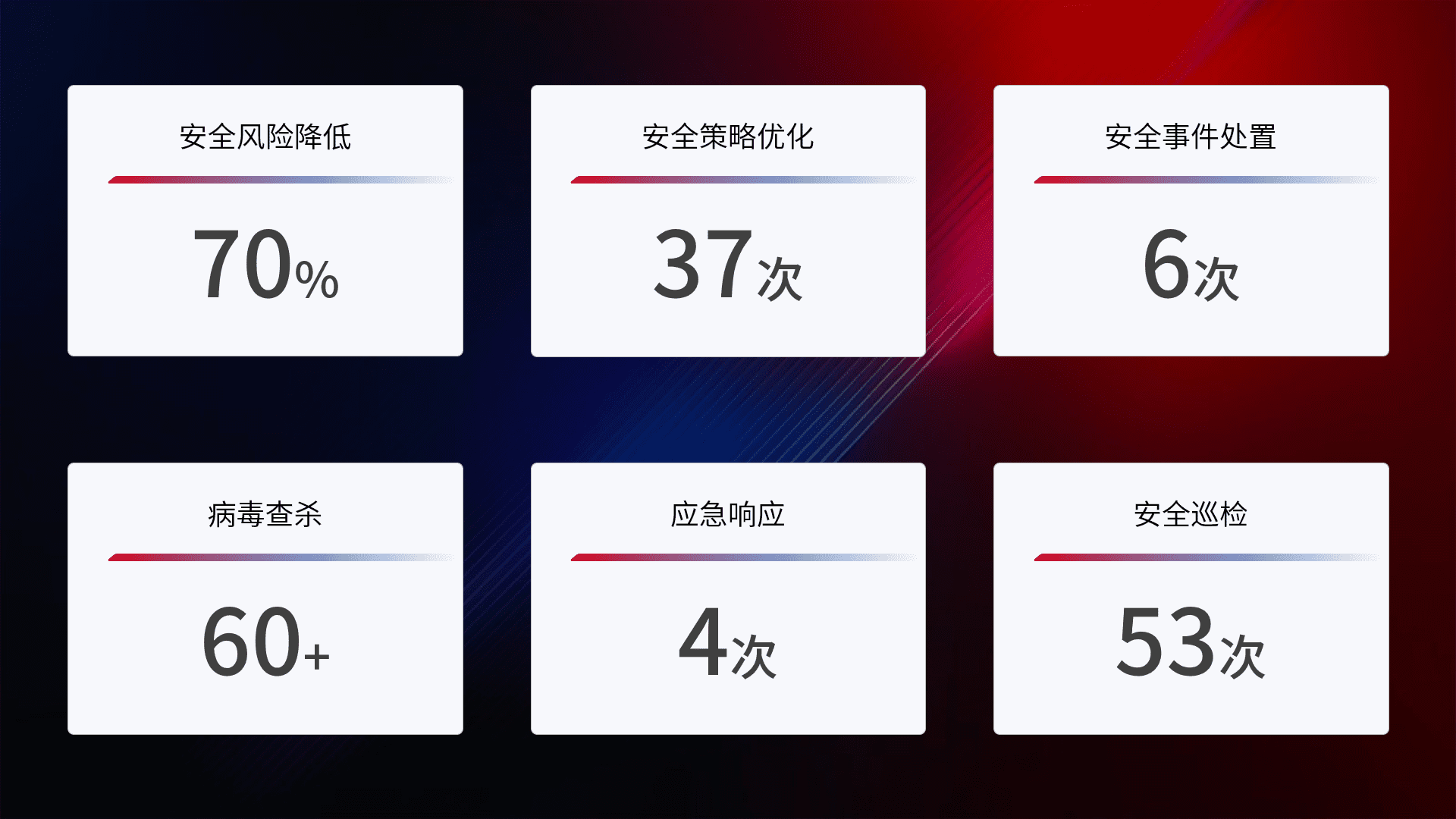提供全面的安全事件报告体系,,包括处置报告、、周报、、、、季度和年度总结,,,结合持续监控,,,,帮助客户深入了解网络安全状况。。